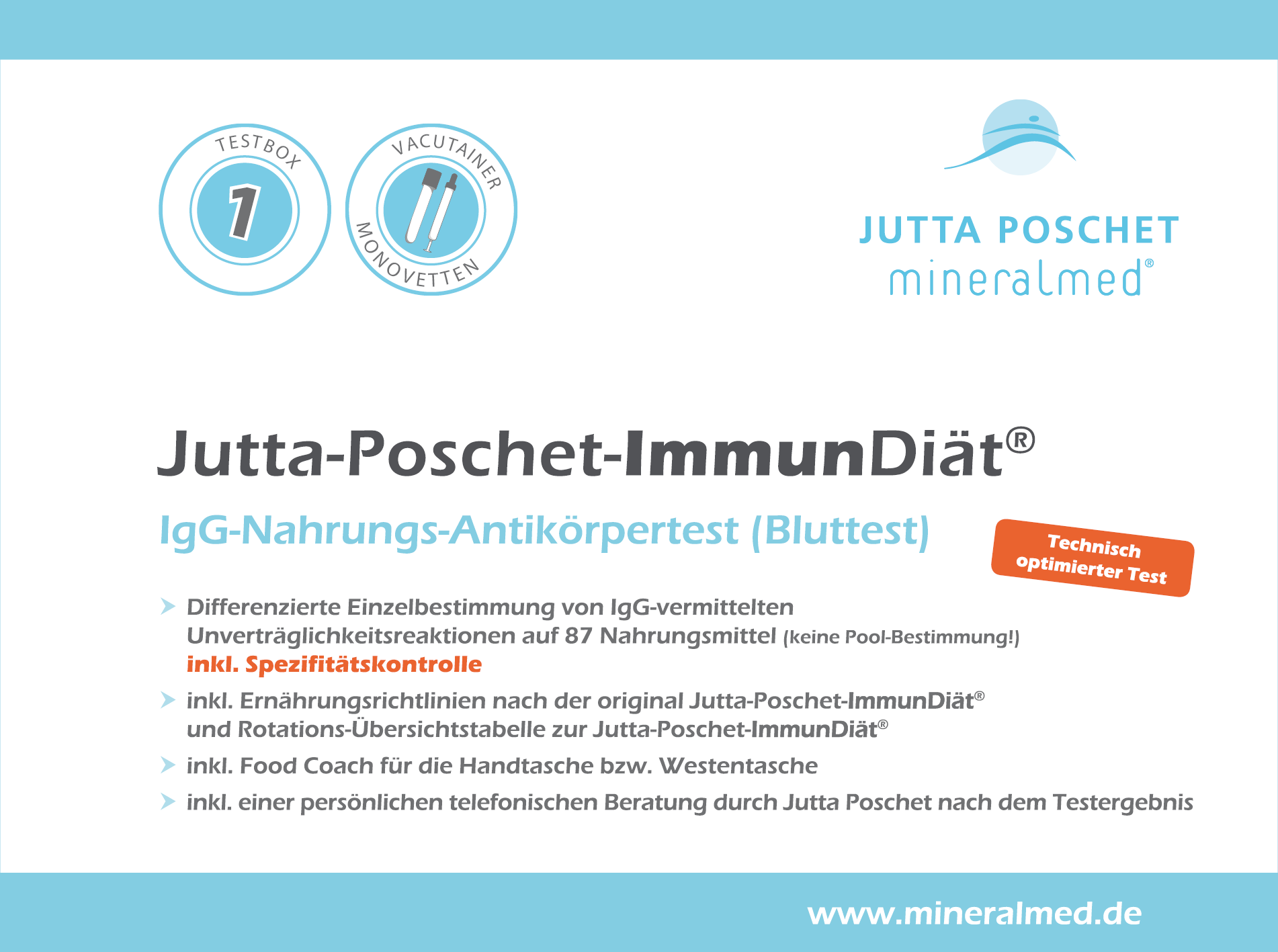 - Die individuelle Testinterpretation erfolgt inklusive Ernährungsrichtlinien nach der original Jutta-Poschet-ImmunDiät® durch Jutta Poschet persönlich. Sie steht nach Übersendung des Testergebnisses für eine ausführliche, telefonische Beratung zur Ernährungsumstellung zur Verfügung.